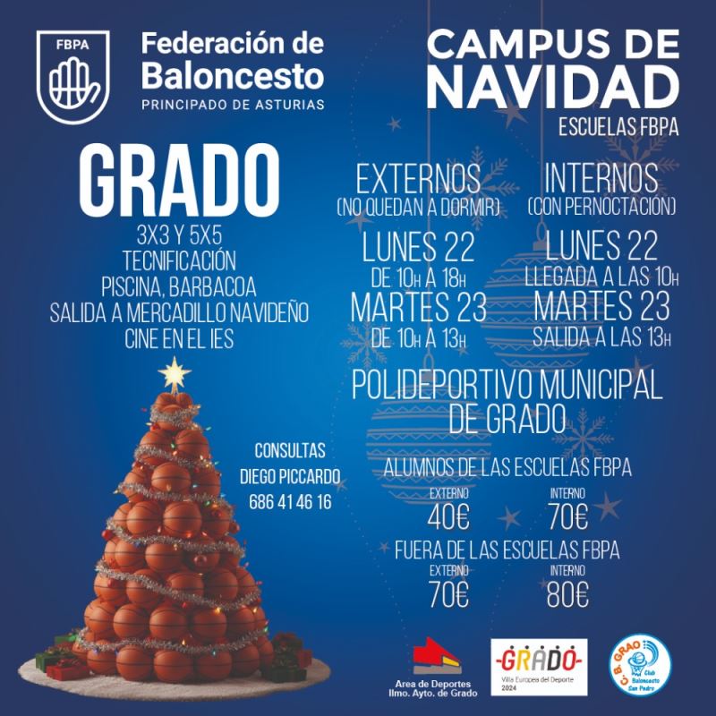 CAMPUS DE NAVIDAD FBPA miércoles, 3 de diciembre de 2025 Galería Vídeo UNA EDICIÓN MÁS LAS NAVIDADES LLEGAN IMPREGNADAS POR NUESTROS CAMPUS DE NAVIDAD A CELEBRAR EN GRADO Y ARRIONDAS Como todos los años, estas navidades tendremos nuestro clásico campamento de Navidad que se realizará en GRADO. En estas jornadas realizarán de actividades recreativas relacionadas con el baloncesto, competiciones de 3x3 y 5x5. Este año implementaremos tecnificación específica para aquellos que compiten o están más avanzados, sujeta al grupo de apuntados. También tendremos piscina, barbacoa, salida nocturna al mercadillo navideño y antes de ir a dormir. cine en el IES Cesar Rodríguez. Un planazo Navideño!!GRADOHorario para los externos (los que no quedan a dormir) Lunes 22 de 10 a 18 horas Martes 23 de 10 a 13 horasHorario para los internos (los quedan a dormir) Entra el lunes 22 a las 10 horas. Salida el Martes 23 a las 13 horas. Coste alumnos escuelas externos: 40 Euros Fuera de las escuelas externos: 45 EurosCoste alumnos escuelas internos: 70 Euros Fuera de las escuelas internos: 80 Euros Y como no podía faltar, el campus de ARRIONDAS, un año más.. Con mucho baloncesto y tecnificación para los mas avanzados, conforme al nivel de los asistentes.. ARRIONDAS: Domingo 21 de diciembrePolideportivo Municipal de ArriondasDe 10 a 17 horas.Coste alumnos escuelas: 35 EurosFuera de las escuelas: 40 Euros¡PASA LA NAVIDAD DISFRUTANDO DE TU DEPORTE FAVORITO!