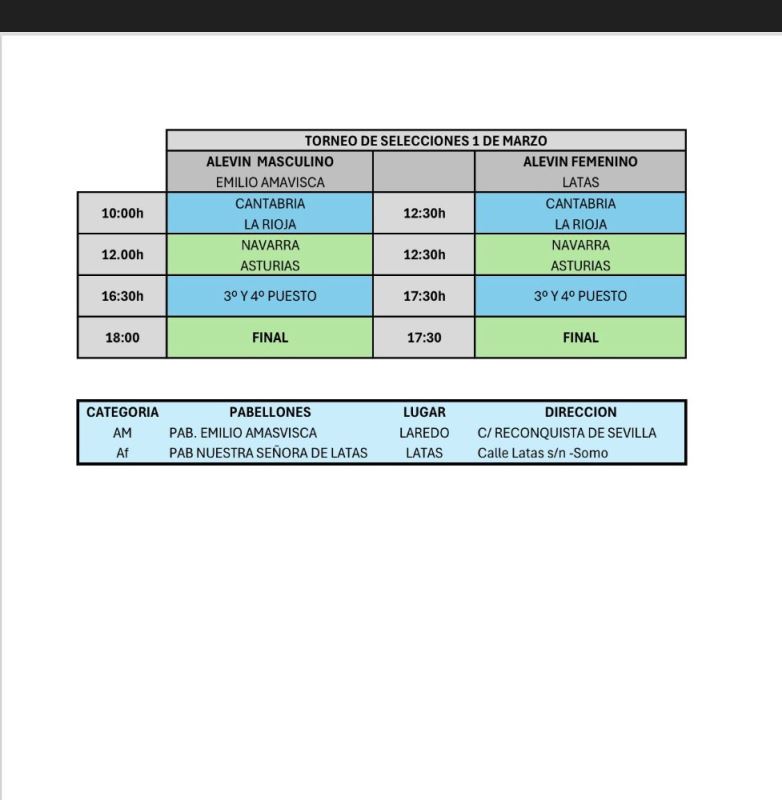 CONVOCATORIA FBPA ALEVINES AMISTOSOS CANTABRIA miércoles, 25 de febrero de 2026 Galería Vídeo SE ADJUNTAN HORARIOS Y LISTADO DE CONVOCADOS PARA LOS PARTIDOS AMISTOSOS QUE NUESTRAS SELECCIONES ALEVINES DISPUTAN ESTE DOMINGO EN CANTABRIA El próximo 1 de Marzo y siguiendo el proceso de preparación del CESA de Salou nuestras selecciones se desplazan a Cantabria para jugar un torneo contra la selección anfitriona, Navarra y Rioja.La salida será el domingo 1 desde El Molinon (Lateral que da a la Guia) a las 08:00 horas y la vuelta al finalizar el último partido.Recordamos a los participantes que tienen que llevar las equipaciones reversibles y el chandal FBPA y un bocadillo para la comida que la haremos en el pabellón junto con las otras selecciones.Adjuntamos en imagen horarios de los partidos.Cualquier observacion escribid al correo selecciones@fbpa.es Documentos adjuntos CONVOCATORIA ALEVÍN MASCULINA CONVOCATORIA ALEVÍN FEMENINO