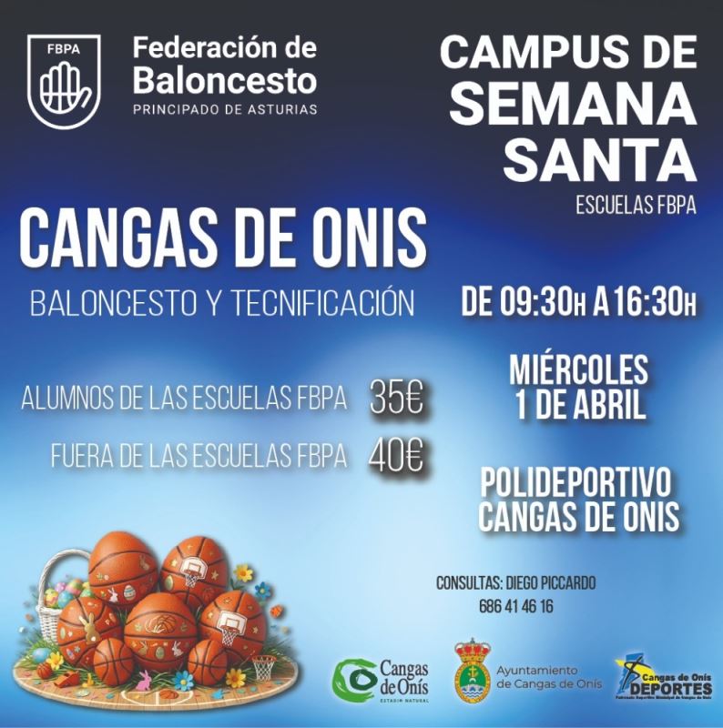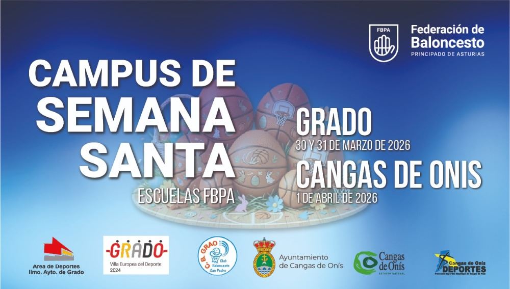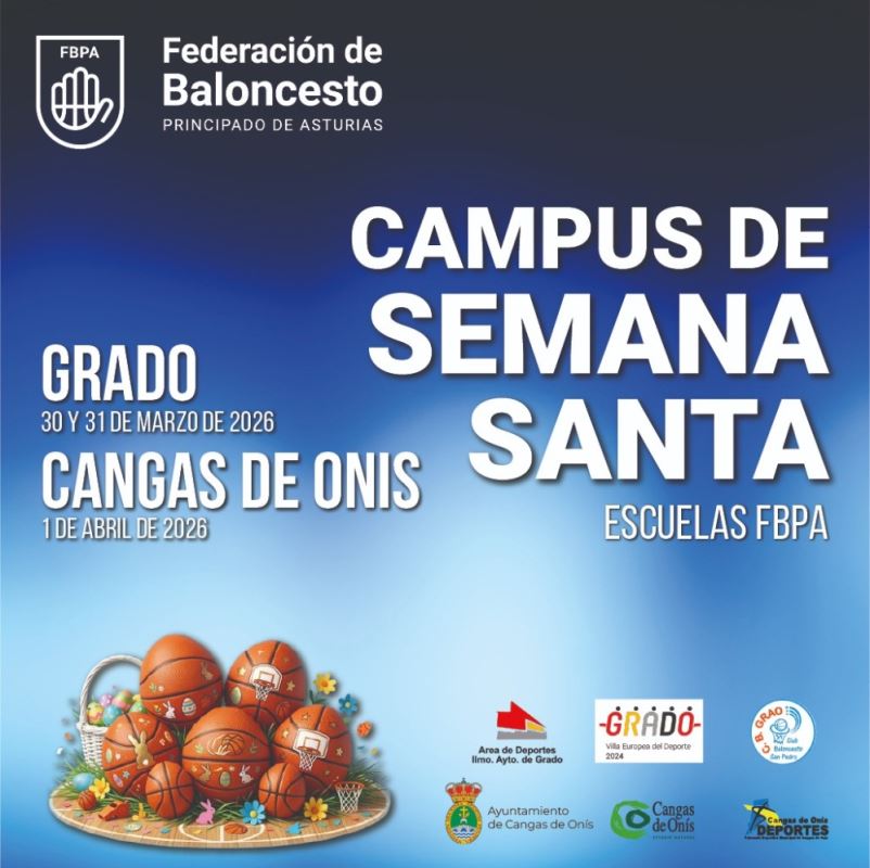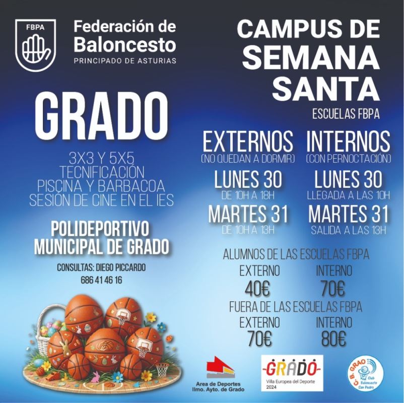 CAMPUS SEMANA SANTA FBPA lunes, 16 de marzo de 2026 Galería Vídeo DEL 30 DE MARZO AL 1 DE ABRIL GRADO Y CANGAS DE ONÍS TE ESPERAN CON LOS BRAZOS ABIERTOS CON NUESTROS CAMPUS FBPA DE SEMANA SANTA Semana Santa, fecha de tradiciones y como buena tradición aparece un año más el Campus de Semana Santa FBPA.El lunes 30 y el martes 31 de marzo y el miércoles 1 de abril llenamos de mucho baloncesto nuestra agenda con las jornadas de Campus que se desarrollarán en Grado y en Cangas de Onís.Actividades variopintas nos acompañarán, desde las más propias del baloncesto como son los partidos 5x5 o 3x3 o la tecnificación, hasta actividades lúdicas como la piscina, la barbacoa o las sesiones de cine.No pierdas la oportunidad de animarte y pasar un buen rato con nosotros.Contacto: Diego Piccardo 686414616